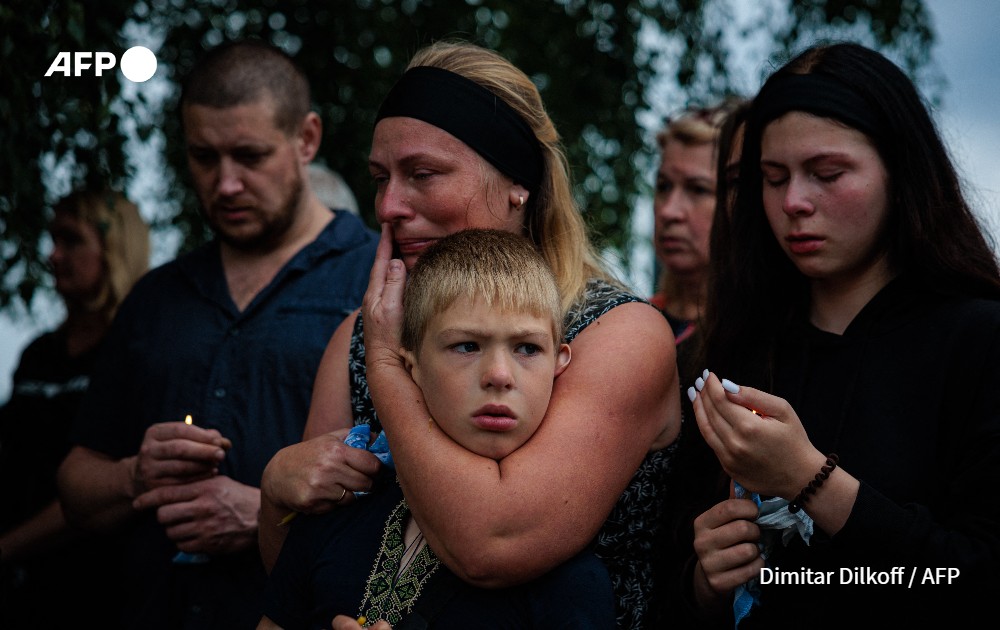 Family members mourn during the funeral ceremony of Ukrainian serviceman Anton Savytskyi at Bucha's cemetery in Kyiv region on August 13, 2022, amid the Russian military invasion of Ukraine.