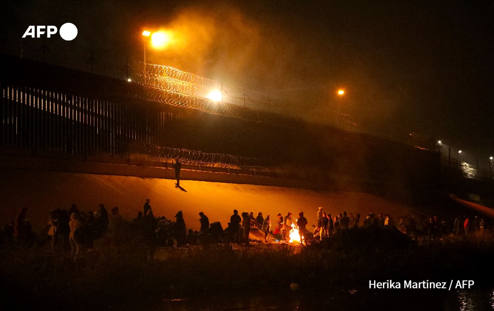 Migrants try to keep warm by a fire while waiting in line to be processed by the Border Patrol along the border wall after crossing the Rio Grande river into El Paso, Texas on the US-Mexico border as seen from Ciudad Juarez, Chihuahua state, Mexico on December 19, 2022.