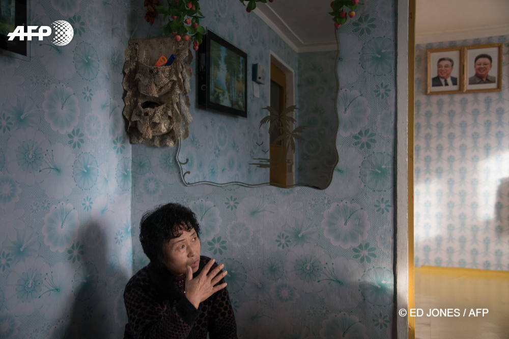 21/11/2017 - Rason, North Korea - In a photo taken on November 21, 2017, Ra In-Hae, 46, sits in her new home after her old house was damaged by flooding, before the portraits of late North Korean leaders Kim Il-Sung ans Kim Jong-Il, near Rason. At the northeastern tip of North Korea, where the isolated, nuclear-armed country meets its giant neighbours China and Russia, United Nations sanctions on the regime over its weapons programmes are having an impact. And with the North facing further sanctions following its ICBM missile test on November 29, things are unlikely to get any easier for traders involved with the remote region's Rason Special Economic Zone (SEZ). © ED JONES / AFP