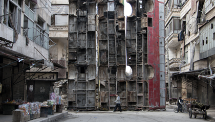 Karam al-Masri recibe el premio especial del jurado por su imagen de una barricada erigida para protegerse contra los francotiradores del régimen sirio, en una calle de Alepo en marzo de 2015.