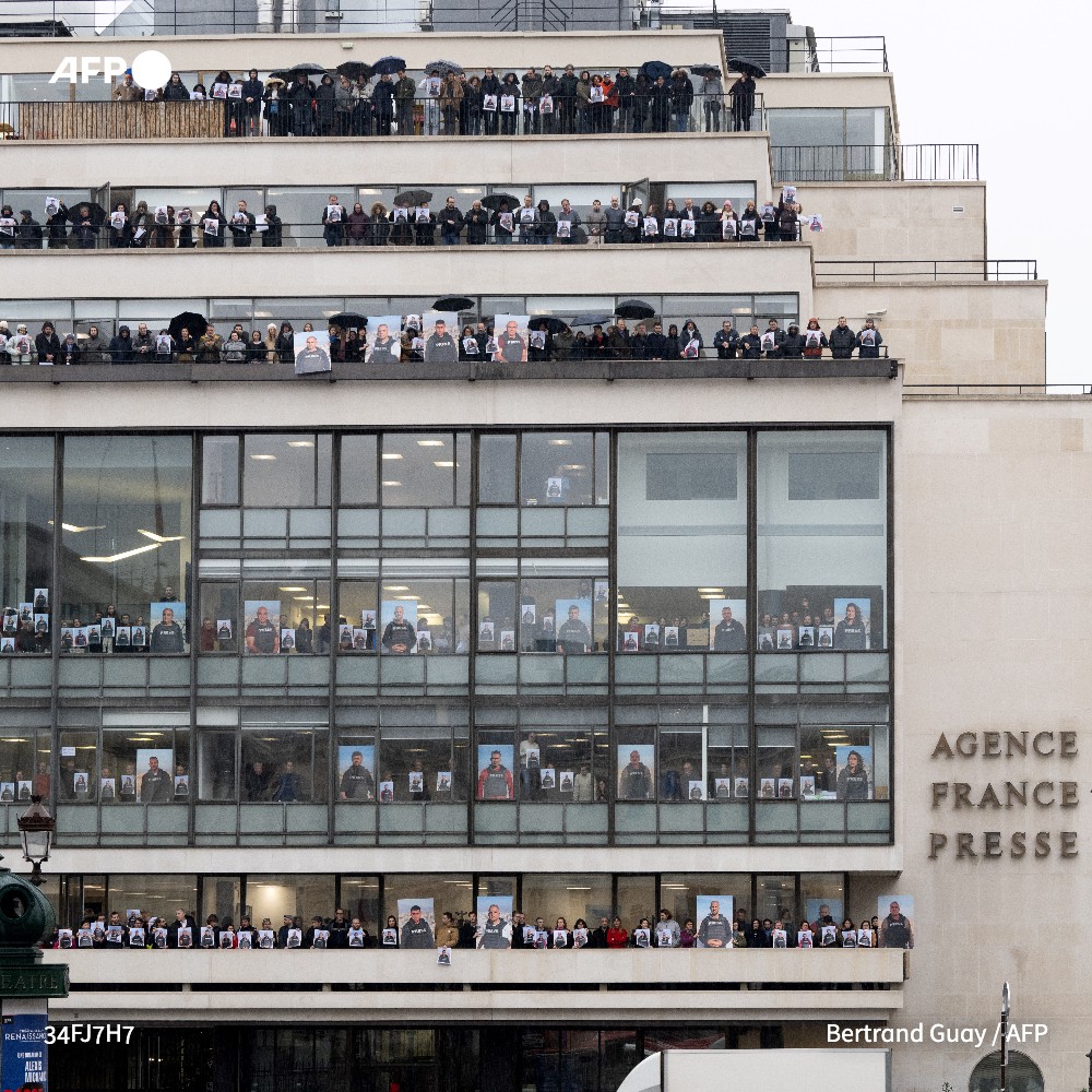En la sede de la AFP en París y en numerosas oficinas en todo el mundo, los asalariados de la AFP sostuvieron simbólicamente retratos de sus nueve compañeros gazatíes, en el marco de una iniciativa organizada por la dirección de la Agencia en coordinación con los sindicatos y la Sociedad de Periodistas.