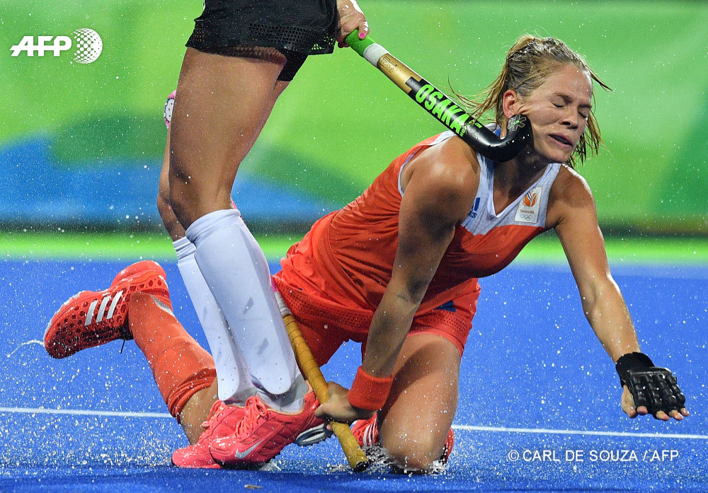 15 août 2016 – Rio de Janeiro, Brésil - La joueuse de hockey néerlandaise Kitty van Male (D) reçoit un coup de crosse au visage lors du quart de finale féminin aux jeux Olympiques de Rio. © AFP PHOTO / CARL DE SOUZA