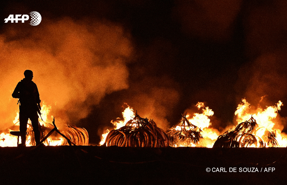 30 avril 2016 – Nairobi, Kenya – Un Ranger du parc national de Nairobi monte la garde devant des stocks illégaux de défenses d’éléphants en feu. © AFP PHOTO / CARL DE SOUZA