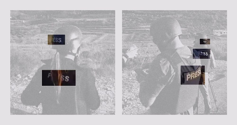 Casques et gilets pare-balles siglés “Press” portés par les journalistes, visibles sur la vidéo postée par Christina Assi sur X. Compte X Christina Assi