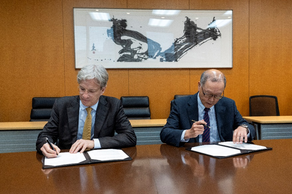 Le président de Jiji Press, Katsuhiko Sakai, et le PDG de l'AFP, Fabrice Fries, ont signé cet accord de trois ans sur la distribution de textes, photos et infographies de l'AFP au Japon, le vendredi 11 avril au siège de Jiji Press à Tokyo.
