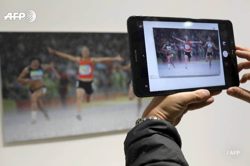 RABAT - 06/04/2018 - Vernissage de l’exposition AFP « Sports et émotions »: un visiteur filme une des 53 photographies présentées par l’Agence France-Presse à la galerie de l'Institut français de Rabat. © AFP