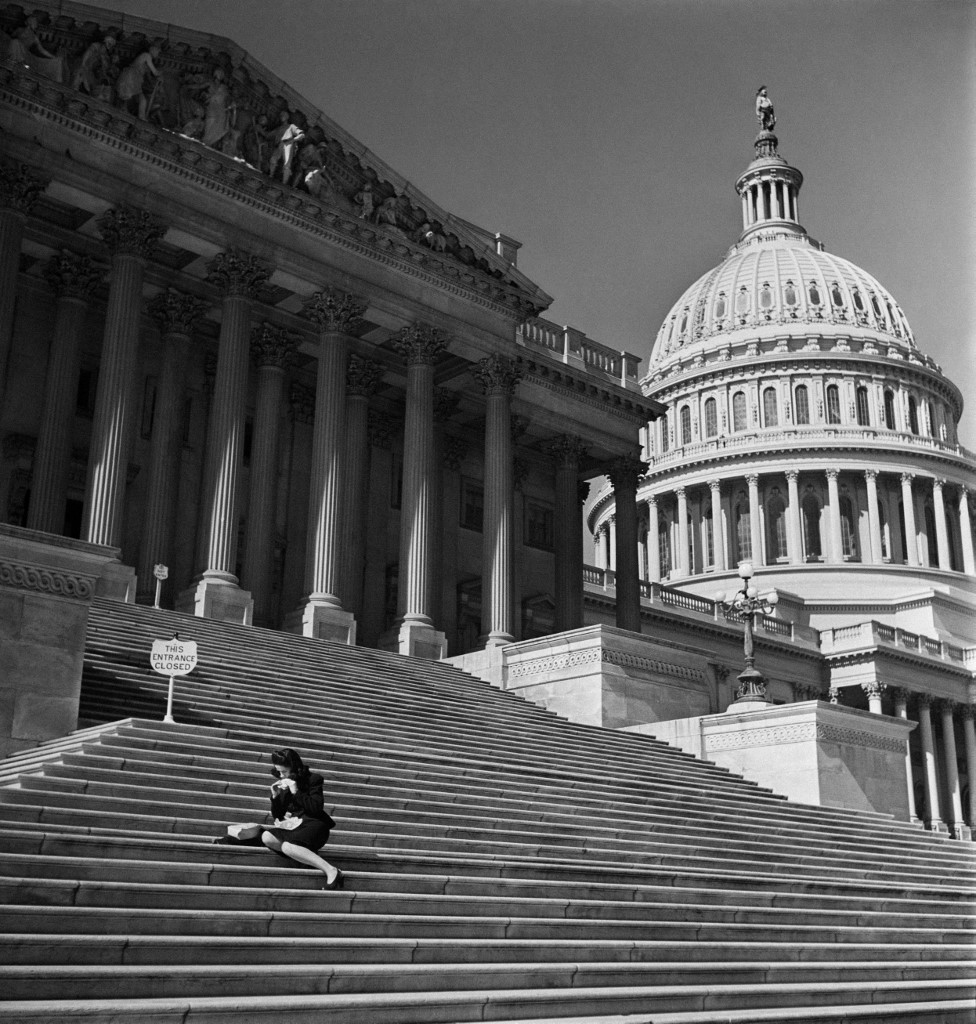 Un instant fugace, figé en noir et blanc. Une jeune journaliste du Washington Post est assise sur les marches du Capitole, lors de sa pause déjeuner.